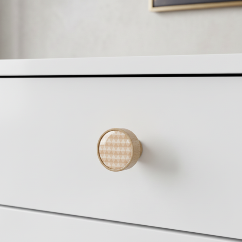 Drevená úchytka ARSIA v prírodnom bukovom prevedení s motívom oranžových trojuholníkov je ideálnym doplnkom pre tých, ktorí chcú do interiéru vniesť hravosť, farbu a moderný geometrický dizajn. Vyrobená z masívneho bukového dreva a lakovaná pre vyššiu odolnosť ponúka spojenie prírodného materiálu a sviežeho dekoru, ktorý sa krásne vyníma na detskom nábytku, moderných komodách či kreatívnych zostavách.