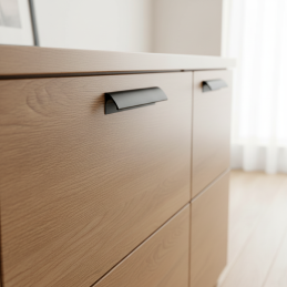 Úchytka NALU v čiernej matnej úprave predstavuje čistý, moderný dizajn s jemne oblým profilom, ktorý pôsobí elegantne a nadčasovo. Jej minimalistický tvar s hladkými líniami je navrhnutý tak, aby prirodzene splýval s nábytkom a zároveň vytváral decentný, ale výrazný dizajnový akcent. Matná čierna farba dodáva úchytke sofistikovaný vzhľad a výborne kontrastuje so svetlými povrchmi, pričom na tmavých pôsobí harmonicky a moderne.