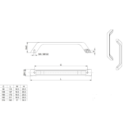 Rozteč 192 mm – celková dĺžka 211 mm, šírka 16,5 mm, výška 25,5 mm