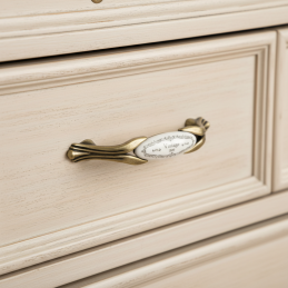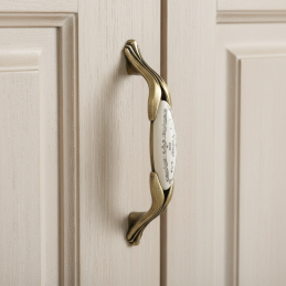Elegantná porcelánová úchytka FRIDA v starozlatom prevedení je dokonalým doplnkom pre každý interiér, ktorý túži po nádychu noblesy a retro elegancie. Jemný porcelán s dekoratívnym vintage motívom je zasadený do kovového korpusu so starozlatou patinou, čo vytvára harmonický a výrazný dizajnový prvok.