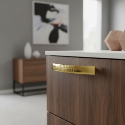 Úchytka VELLEN v zlatom lesklom prevedení dodá vášmu nábytku nádych luxusu a exkluzivity. Jej jemne prehnutý tvar v kombinácii s dekoratívnou štruktúrou drobných bodiek vytvára výrazný, no stále elegantný dizajnový prvok vhodný do moderných aj glamour interiérov.