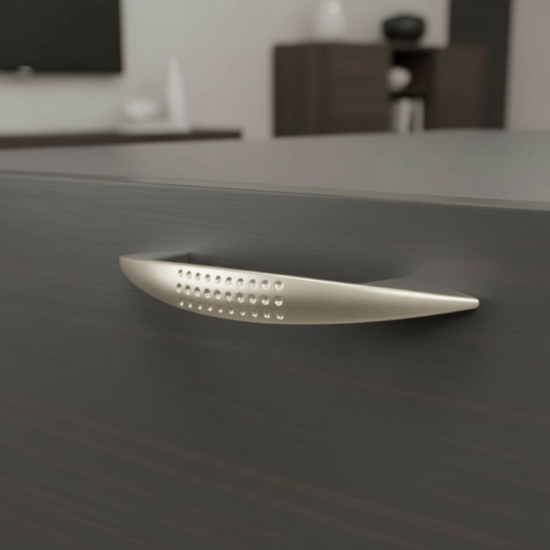 Štýlová úchytka TYLLAU v nikel matnom prevedení ponúka moderný a zároveň nadčasový vzhľad, ktorý elegantne doplní kuchynský, kúpeľňový aj sektorový nábytok. Jemné dekoratívne kovové bodky na prednej strane dodávajú úchytke jedinečný charakter a vizuálne ju odlišujú od bežných modelov.