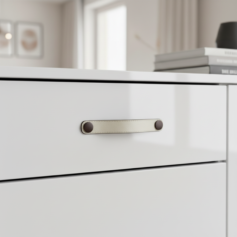 Štýlová kožená úchytka CASE v bielom prevedení predstavuje elegantný doplnok pre moderný aj klasický nábytok. Pravá koža s jemnou textúrou dodáva interiéru luxusný a čistý vzhľad. Kontrastné tmavé kovové krytky vytvárajú atraktívny dizajnový detail.