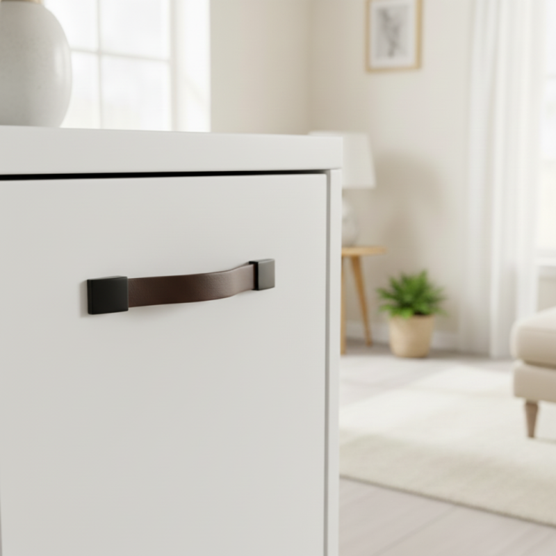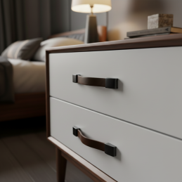 Elegantná kožená úchytka spájajúca pravú hovädziu kožu v hnedom prevedení s čiernymi kovovými koncovkami. Vďaka prehnutému profilu sa príjemne uchopuje a dodáva nábytku moderný, nadčasový vzhľad.