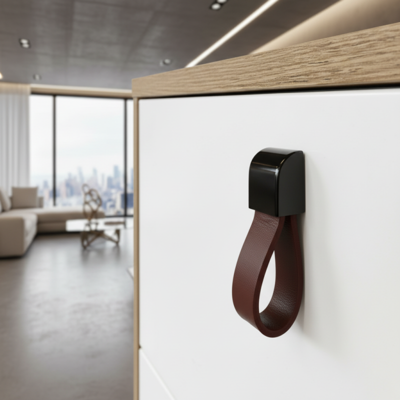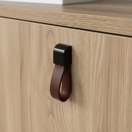 Elegantná kožená knopka LEATY spája pravú hnedú kožu s kovovou koncovkou v čiernom prevedení. Vďaka svojmu modernému tvaru a kvalitným materiálom pôsobí prémiovo a nadčasovo. Je vhodná na skrinky, zásuvky aj dvierka a dodá nábytku príjemný, mäkký dotykový komfort.