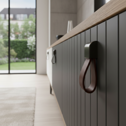 Úchytka je flexibilná, komfortná pri používaní a svojim farebným kontrastom čiernej koncovky a hnedej kože zvýrazní každý moderný či industriálny interiér.