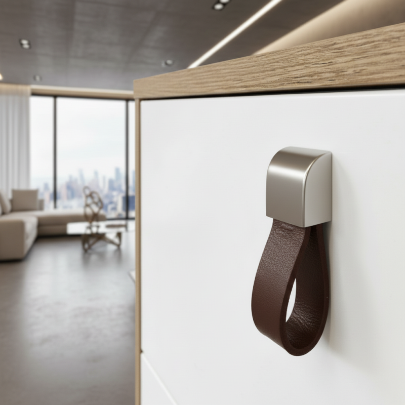 Luxusná kožená knopka LEATY spája pravú hnedú kožu s elegantnou kovovou koncovkou v tmavom nikli. Kombinácia jemnej kože a tmavého kovu vytvára prémiový nadčasový vzhľad, ktorý dokonale doplní moderný aj industriálny nábytok.