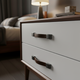 Exkluzívna úchytka z pravej kože v kombinácii so starostriebornými kovovými koncovkami. Elegantný prehnutý tvar a kvalitné materiály dodávajú úchytke jedinečný charakter – skvelo zapadne do moderného aj rustikálne ladeného interiéru.