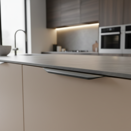 Úchytka ALICANTE v modernom prevedení čierna matná je elegantným riešením pre nábytok, kde je prioritou čistý a minimalistický dizajn. Montuje sa zo zadnej strany dvierok, takže z čelného pohľadu nie sú viditeľné žiadne skrutky, čo zaručuje perfektný estetický výsledok.