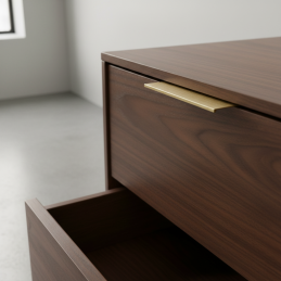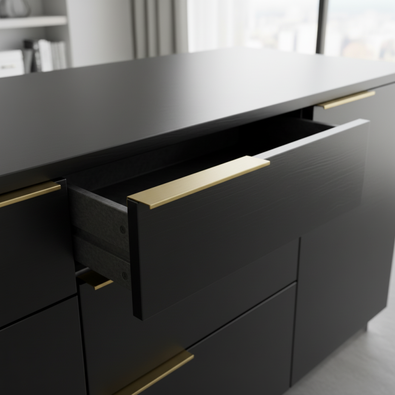 Moderná minimalistická úchytka CANSAS je určená na montáž na hranu dvierok alebo zásuviek. Elegantná brúsená zlatá povrchová úprava dodáva nábytku luxusný vzhľad, no zároveň pôsobí decentne a nadčasovo. Ideálna voľba pre moderné kuchynské linky, šatníky, kúpeľňové skrinky či dizajnový nábytok.