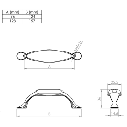 Rozteč (A): 96 mm → Celková dĺžka (B): 124 mm
