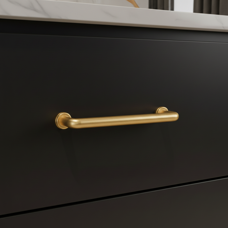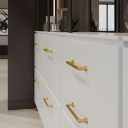 Úchytka NURIA v prevedení zlatá brúsená prináša do interiéru luxusný a zároveň moderný výraz. Jej hladké, zaoblené línie doplnené decentnými prstencami na koncoch pôsobia sofistikovane a nadčasovo. Brúsené zlato vytvára elegantný teplý odtieň, ktorý dokonale ladí s bielym, tmavým aj prírodným nábytkom.