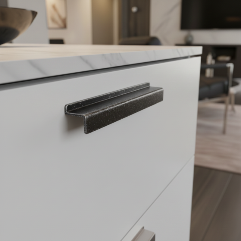 Úchytka BRUNA v prevedení čierna patina spája moderný minimalistický tvar s výrazným dekoratívnym povrchom, ktorý dodáva nábytku jedinečný charakter. Ide o L-úchytku určenú na montáž na hornú hranu dvierok či zásuviek, čo umožňuje otváranie bez klasických viditeľných madiel. Výsledkom je čistý a elegantný vzhľad nábytku.