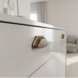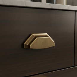 Geometrický tvar zabezpečuje pohodlný úchop a zároveň vytvára výrazný dizajnový prvok, ktorý krásne vynikne na kuchynských linkách, komodách, skriniach či dizajnovom nábytku. Staromosadzný povrch sa skvelo kombinuje s drevom, svetlými aj tmavými dekormi.