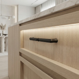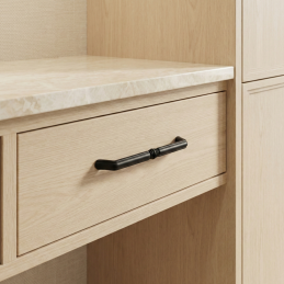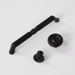 Elegantná nábytková úchytka BELAGIO v čiernom matnom prevedení zaujme klasickým tvarom s jemným dekoratívnym prvkom v strede. Vďaka svojmu nadčasovému dizajnu sa hodí do moderných aj tradičných interiérov – do kuchýň, komôd, skríň či kúpeľňového nábytku.