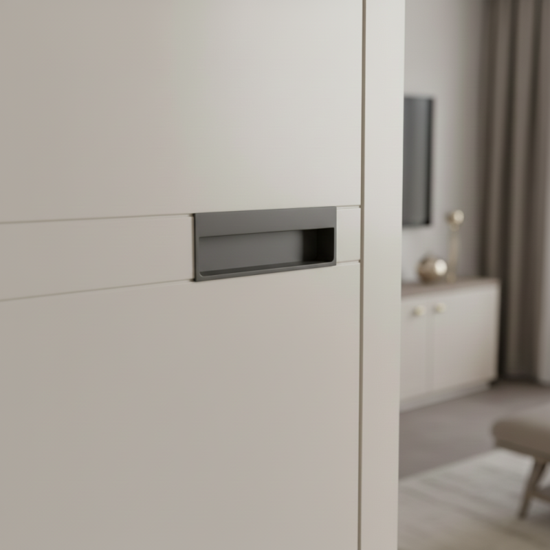 Moderná zapustená úchytka TALIA v atraktívnej antracit matnej povrchovej úprave je ideálnym riešením pre minimalistický a elegantný nábytok. Zapustenie do čela zásuvky alebo dvierok vytvára čistú, nerušenú líniu, ktorá pôsobí profesionálne a dizajnovo. Perfektne sa hodí do kuchýň, kúpeľní, šatníkov aj obývacích zostáv.