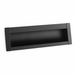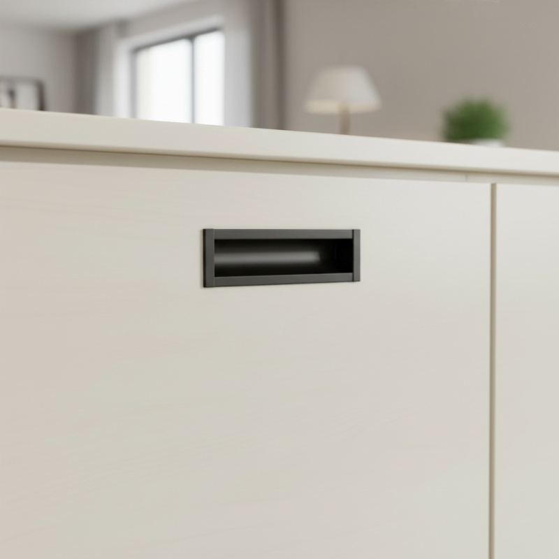 Moderná minimalistická úchytka určená na zafrézovanie do plochy dvierok alebo zásuviek. Elegantná matná čierna povrchová úprava dodáva nábytku čistý a moderný vzhľad.