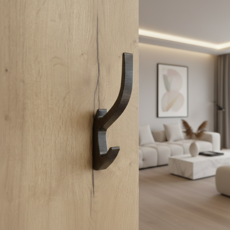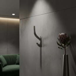 Moderný vešiak KOS v elegantnom čiernom brúsenom prevedení ponúka kombináciu minimalistického dizajnu a jemnej textúry kovu. Brúsený povrch dodáva vešiaku luxusný matný vzhľad, ktorý sa skvelo hodí do moderných, industriálnych aj prémiových interiérov. Praktický dvojitý háčik umožňuje pohodlné odkladanie oblečenia, uterákov či doplnkov.