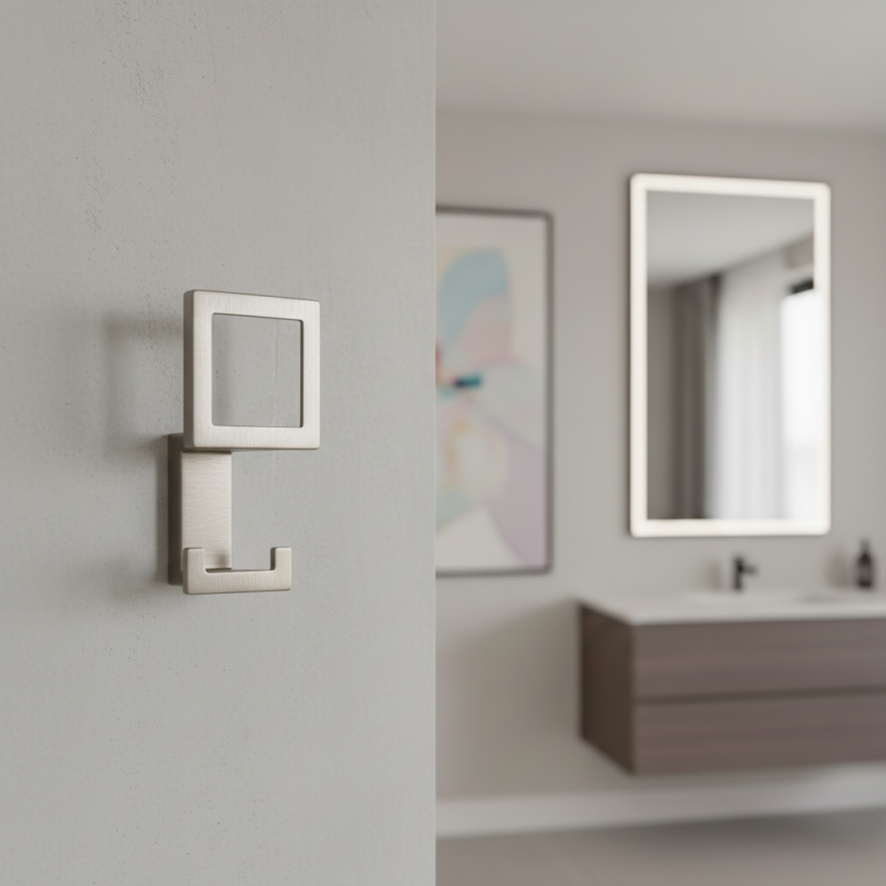 Vešiak je vyrobený z kvalitného kovu s brúsenou niklovou povrchovou úpravou, ktorá pôsobí elegantne, moderne a zároveň je odolná voči bežnému opotrebeniu.
