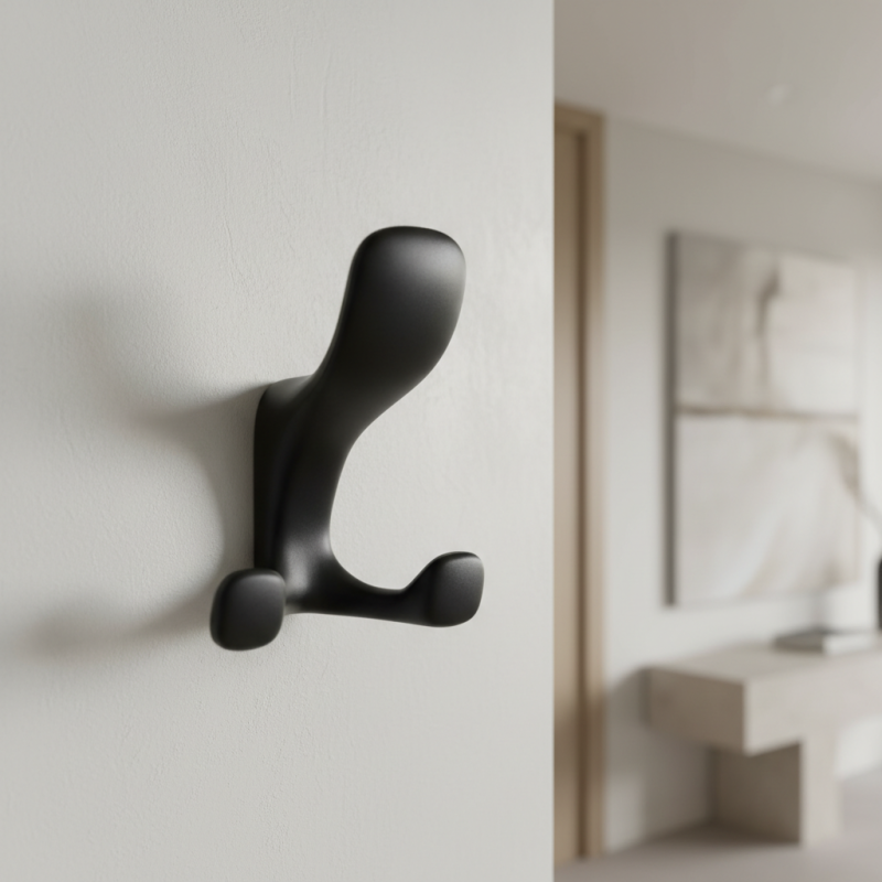 Dizajnový vešiak MESSINA v elegantnom prevedení čierna matná je výrazným a štýlovým doplnkom moderných interiérov. Jeho organický, plynulo tvarovaný dizajn pôsobí esteticky a zároveň prakticky, vďaka čomu sa stáva funkčným detailom aj dekoratívnym prvkom.