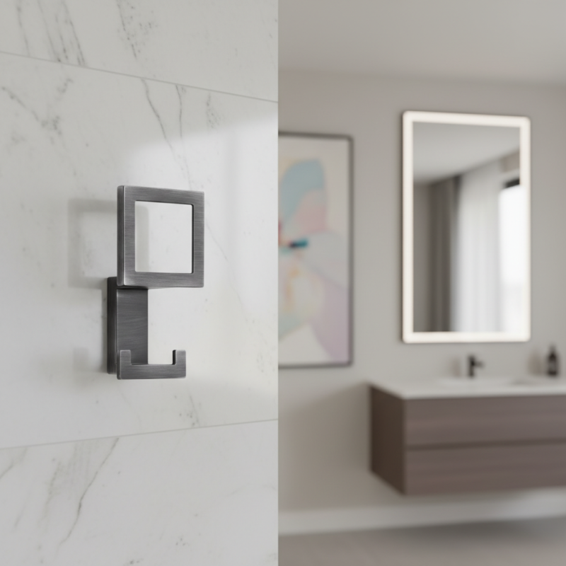 Vešiak je vyrobený z kvalitného kovu s brúsenou povrchovou úpravou v čiernej farbe, ktorá je odolná voči opotrebeniu a zároveň príjemná na dotyk.