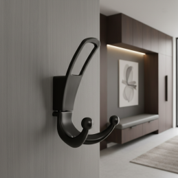 Vešiak má jednodielnu konštrukciu so spodným dvojitým háčikom, ktorý poskytuje dostatok priestoru na zavesenie kabátov, búnd, tašiek alebo doplnkov. Je určený na montáž zpredu na stenu alebo nábytok, pričom upevňovacie body sú viditeľné a umožňujú rýchlu a jednoduchú inštaláciu.