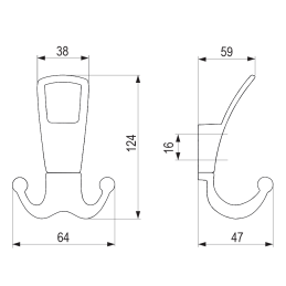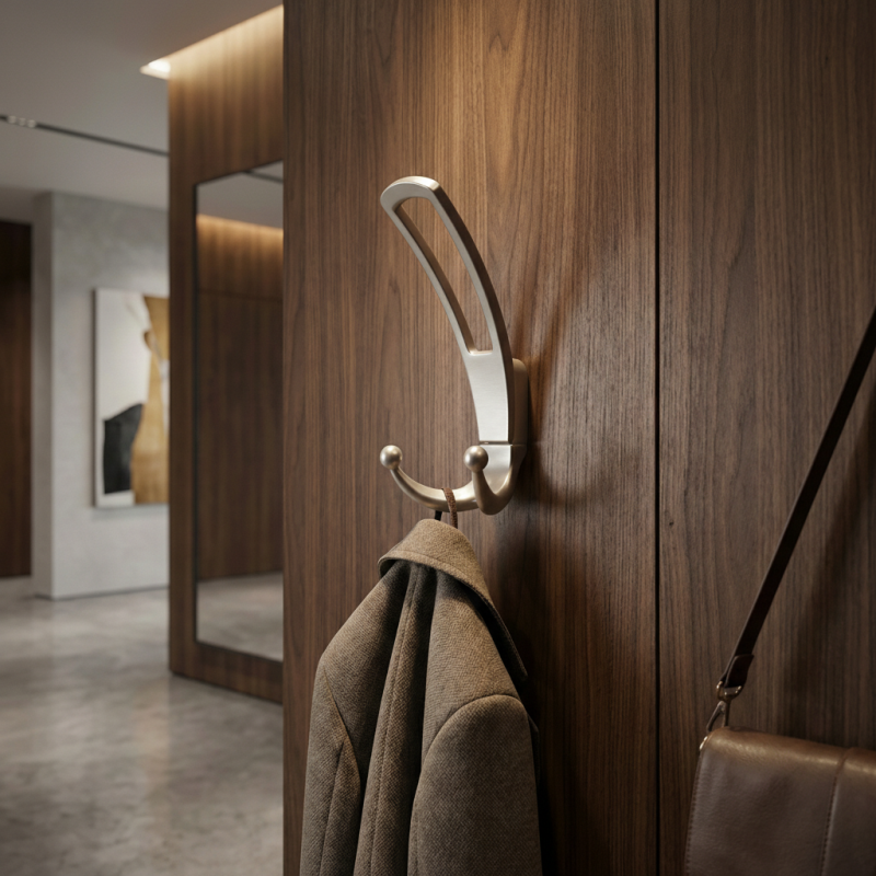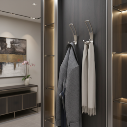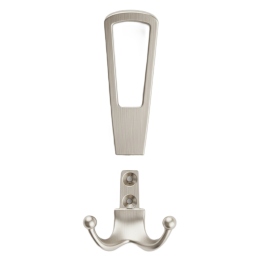 Vešiak má dvojdielnu konštrukciu, ktorá pozostáva z horného madla a spodného dvojitého háčika, čím poskytuje dostatok priestoru na zavesenie kabátov, búnd, tašiek alebo doplnkov. Je určený na montáž zpredu na stenu alebo nábytok, s viditeľnými upevňovacími bodmi pre jednoduchú inštaláciu.
