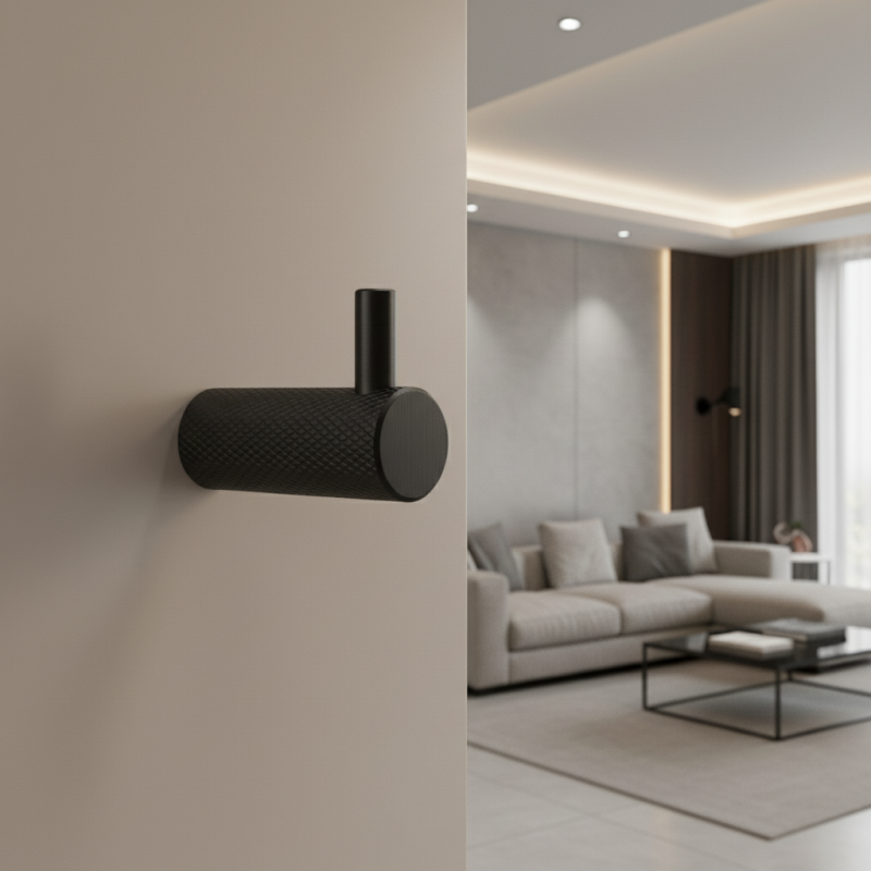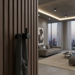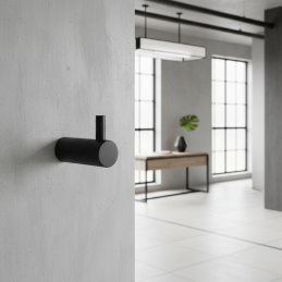 Vešiak INDUST UNO v štýlovej čiernej matnej povrchovej úprave prináša čistý industriálny dizajn s výrazným ryhovaným (knurled) povrchom. Vďaka svojmu kompaktnému tvaru a elegantnej siluete je ideálny do predsiene, kúpeľne, kuchyne, šatníka aj kancelárie.