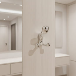 Vešiak je vybavený dvojitým háčikom, ktorý umožňuje pohodlné zavesenie kabátov, búnd, kabeliek či doplnkov. Je určený na montáž zpredu na podložku (stenu alebo nábytok), pričom upevňovacie skrutky sú prístupné z prednej strany a zabezpečujú jednoduchú inštaláciu.