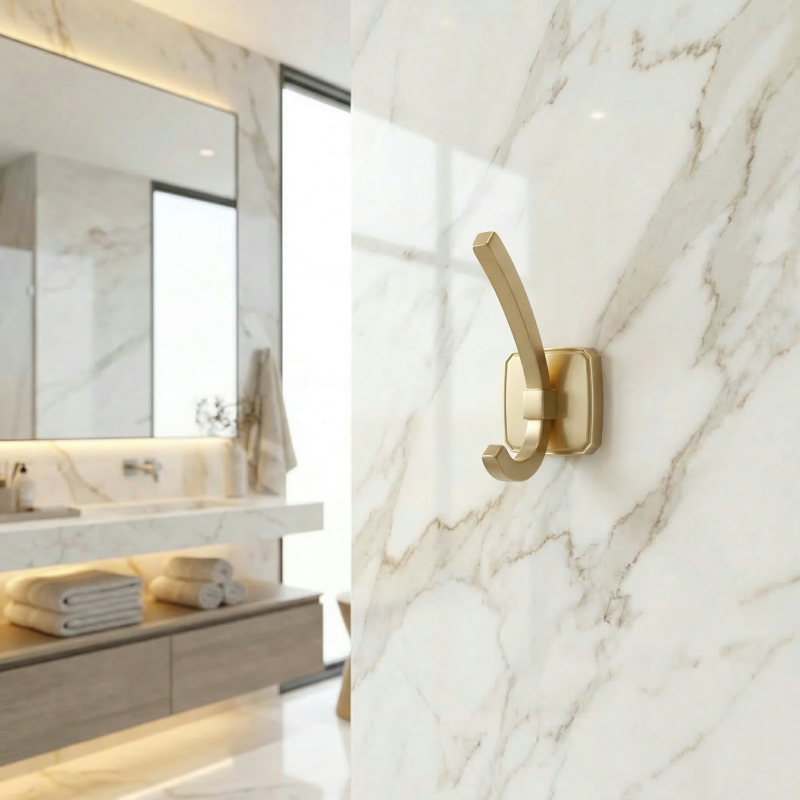 Elegantný nástenný vešiak EMILY je štýlovým doplnkom do kúpeľne, predsiene alebo šatníka. Brúsené zlaté prevedenie dodáva interiéru luxusný a moderný vzhľad, ktorý sa skvele hodí do klasických aj moderných priestorov.