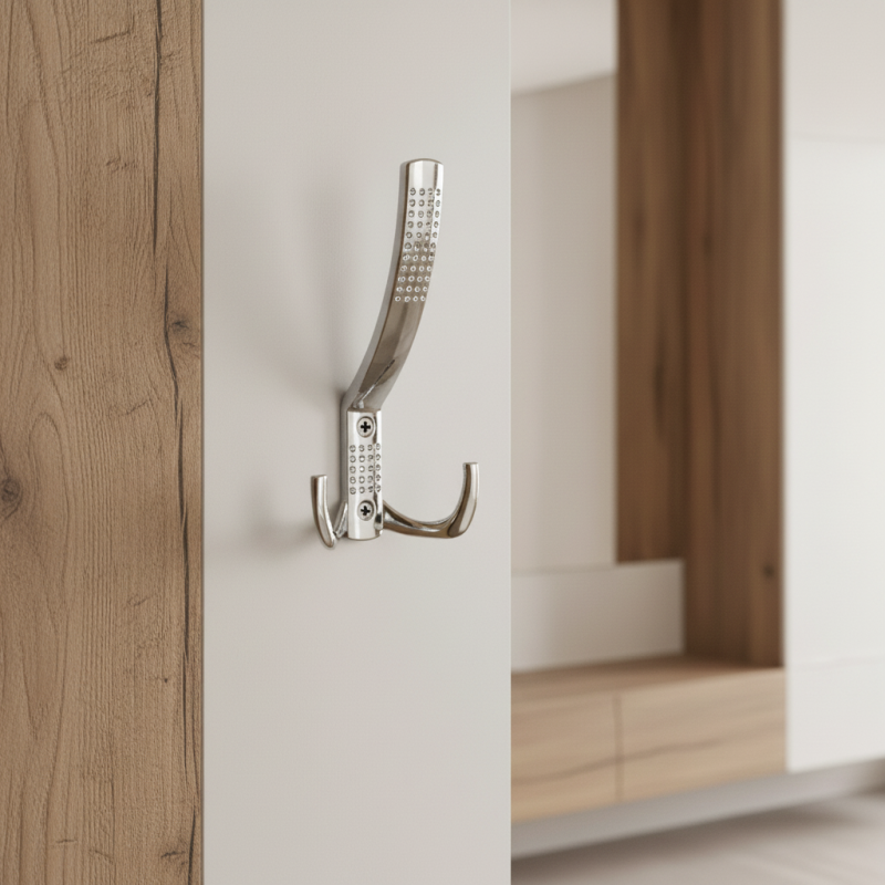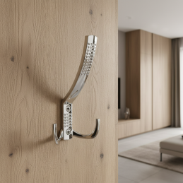 Moderný nábytkový vešiak väčších rozmerov s dvoma pevnými háčikmi, vhodný na každodenné používanie. Lesklá chrómovej povrchová úprava dodáva vešiaku čistý, elegantný a nadčasový vzhľad, vďaka ktorému sa výborne hodí do moderných interiérov aj reprezentatívnych priestorov.