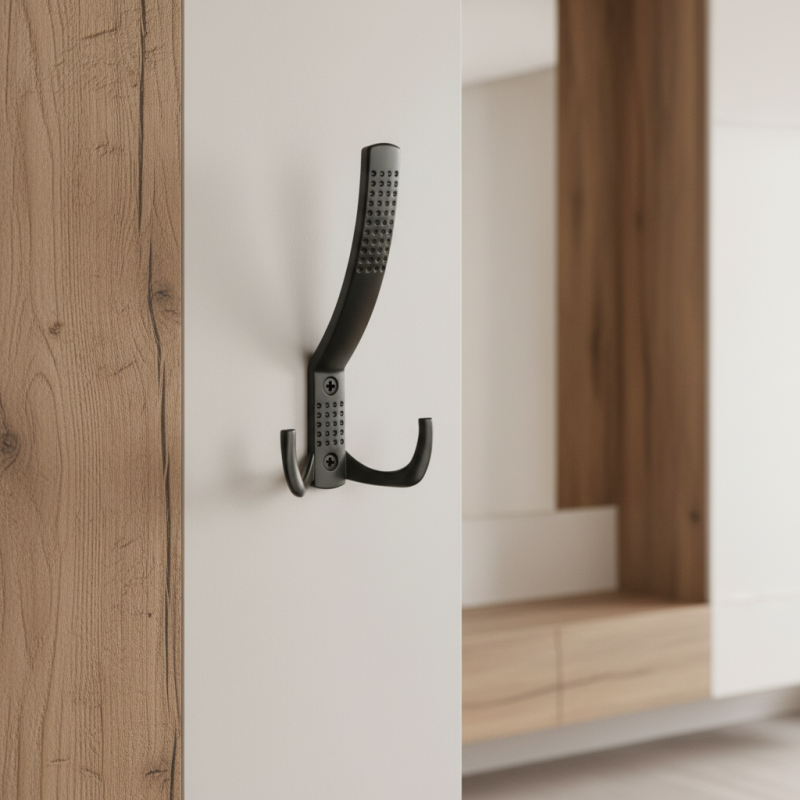 Robustný a elegantný nábytkový vešiak s dvoma háčikmi, navrhnutý pre pohodlné odkladanie aj ťažších odevov. Vďaka modernej matnej čiernej povrchovej úprave pôsobí štýlovo a jednoducho sa kombinuje s rôznym nábytkom a kovaniami. Ideálny do predsiení, šatníkov a komerčných priestorov.
