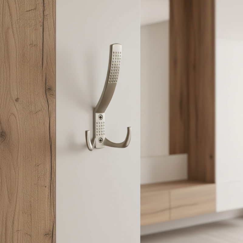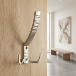 Elegantný nábytkový vešiak väčších rozmerov s dvoma háčikmi, vhodný na každodenné používanie aj na ťažšie odevy. Saténová niklová povrchová úprava dodáva vešiaku jemný moderný vzhľad, ktorý sa ľahko kombinuje s rôznymi štýlmi interiéru.