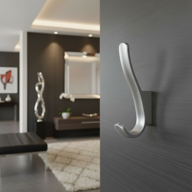 Vďaka montáži z prednej strany na skrytú podložku zostáva uchytenie úplne neviditeľné, čo podčiarkuje čistý a elegantný vzhľad na stene. Vešiak je vhodný do predsiení, šatníkov, kúpeľní aj spální, kde spája funkčnosť s dizajnovým detailom.