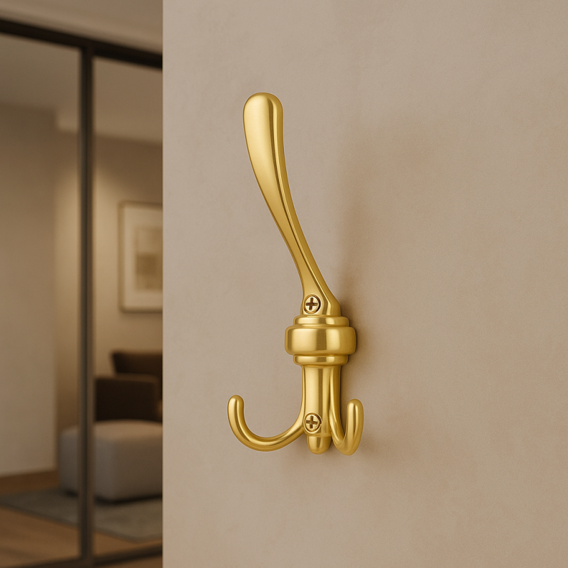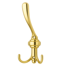 Elegantný trojramenný vešiak v zlatej lesklej úprave, ktorý spája klasický tvar s luxusným vzhľadom. Vďaka svojmu lesklému povrchu a prepracovanému dizajnu pôsobí reprezentatívne a dodá interiéru nádych elegancie. Ideálny do predsiene, kúpeľne, spálne alebo kancelárie.