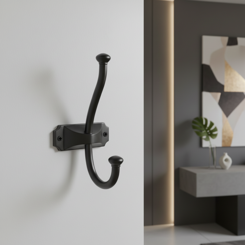 Nábytkový vešiak PORTO v modernej čiernej matnej úprave je elegantným a praktickým riešením pre predsiene, šatníky, kúpeľne či spálne. Jeho klasický dvojháčikový tvar umožňuje pohodlné zavesenie odevov, tašiek či doplnkov, pričom horný aj dolný háčik poskytujú dostatok priestoru a stabilitu.