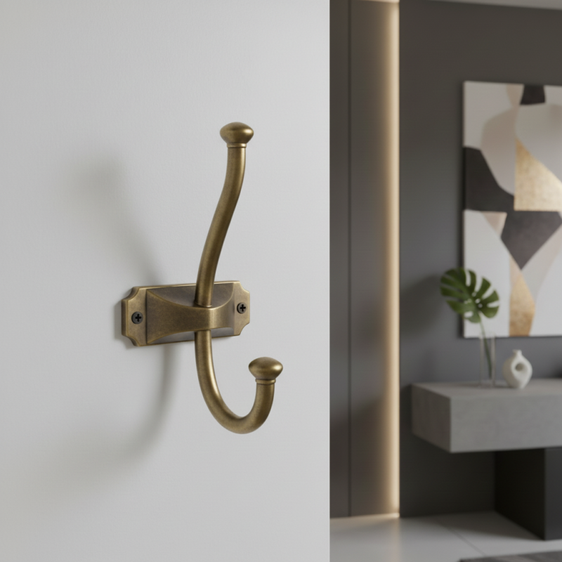 Nábytkový vešiak PORTO v povrchovej úprave staromosadz je štýlovým a funkčným prvkom, ktorý dodá vášmu interiéru teplý, elegantný a jemne vintage vzhľad. Dvojháčiková konštrukcia umožňuje zavesenie viacerých kusov oblečenia naraz – horný háčik je ideálny na kabáty či bundy a spodný na tašky alebo menšie doplnky.