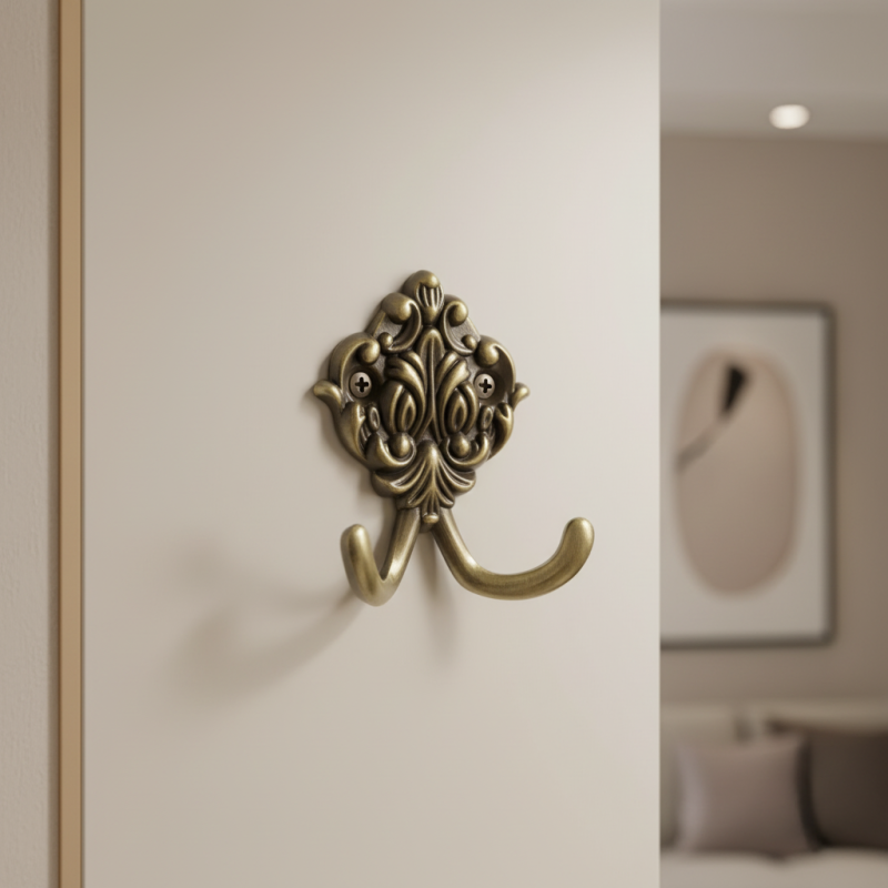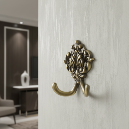 Vešiak rustikálny RITUAL / Staromosadz je výrazným dekoratívnym prvkom, ktorý v sebe spája funkčnosť a bohatý klasický dizajn. Jeho ornamentálne spracovanie s jemnými reliéfmi a dvojitým háčikom odkazuje na tradičný rustikálny štýl a dodáva interiéru autentický historický charakter.