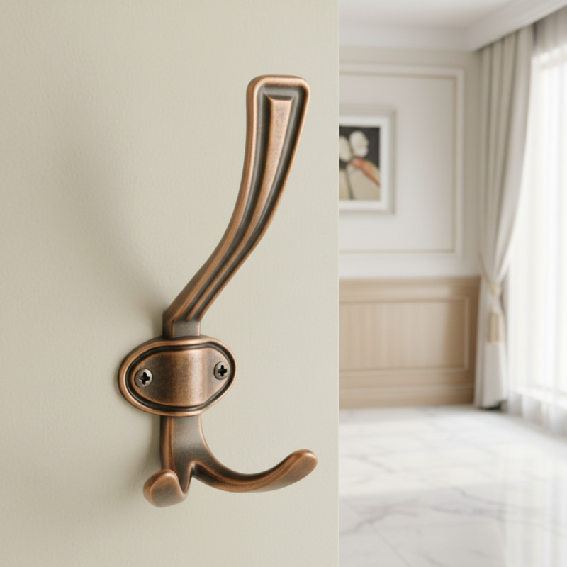 Prevedenie v antik medi dodáva vešiaku výrazný historický charakter s jemnou patinou, ktorá krásne doplní drevený nábytok aj rustikálne prvky interiéru.