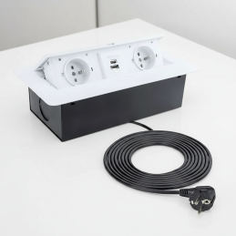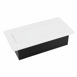 Moderná výklopná vstavaná elektrická zásuvka KOMBI BOX v bielom prevedení je praktickým a elegantným riešením pre pracovné stoly, kuchynské ostrovčeky, kancelársky nábytok aj obývacie zostavy. Vďaka výklopnému mechanizmu zostáva zásuvka pri nepoužívaní skrytá a zachováva čistý, nerušivý vzhľad interiéru.