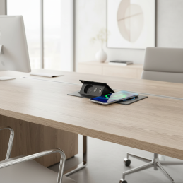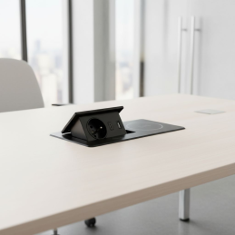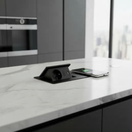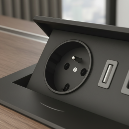 Moderná a ergonomická výklopná elektrická zásuvka určená na montáž do pracovného stola, kuchynskej dosky alebo kancelárskeho nábytku. Otvára sa jednoduchým stlačením tlačidla (push-to-open) a zatvára sa ručným zaklopením. Ponúka praktické a bezpečné riešenie pre nabíjanie elektroniky aj pripojenie spotrebičov.