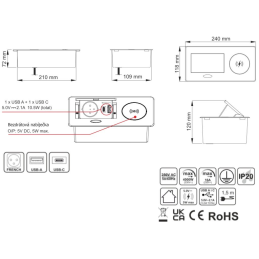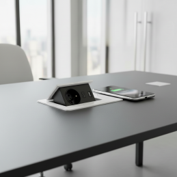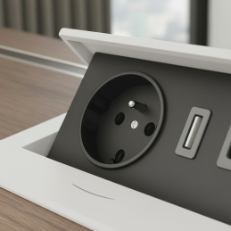 Moderná a ergonomická výklopná elektrická zásuvka určená na montáž do pracovného stola, kuchynskej dosky alebo kancelárskeho nábytku. Otvára sa jednoduchým stlačením tlačidla (push-to-open) a zatvára sa ručným zaklopením. Ponúka praktické a bezpečné riešenie pre nabíjanie elektroniky aj pripojenie spotrebičov.