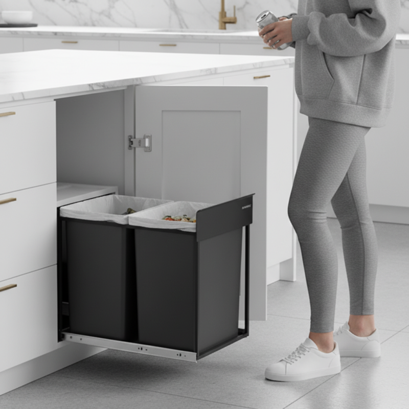 Kôš je navrhnutý na montáž do spodnej kuchynskej skrinky, kde zostáva diskrétne ukrytý. Pomáha:
