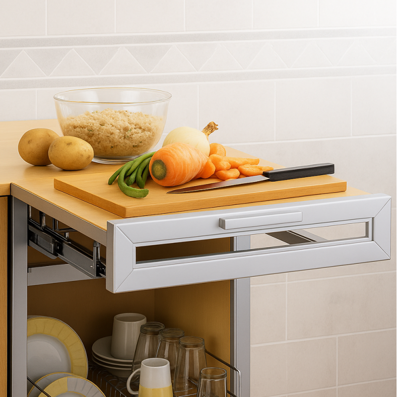 Výsuvný pracovný stôl je ideálnym pomocníkom, keď potrebujete rýchlo získať viac priestoru – napríklad pri krájaní zeleniny alebo príprave jedál. Vďaka jednoduchému mechanizmu sa po otvorení zásuvky stôl automaticky vysunie a poskytne stabilnú dodatočnú plochu.