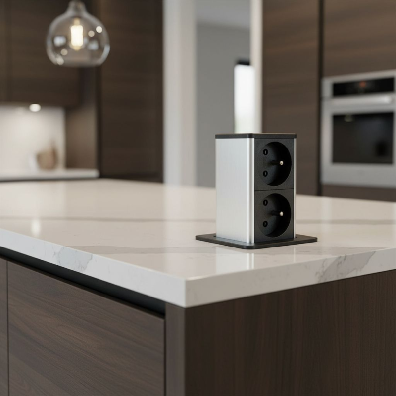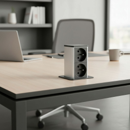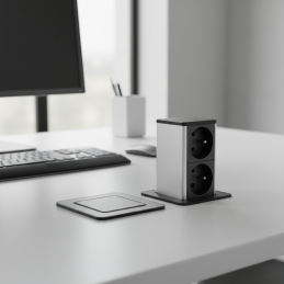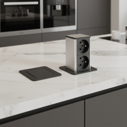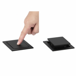Elegantná výsuvná zásuvka SQUARE UP v čiernej matnej farbe ponúka praktické a estetické riešenie pre kuchyne, pracovné stoly či kancelárie. V zatvorenom stave je nenápadná a dokonale splýva s povrchom nábytku – po stlačení sa plynulo vysunie a sprístupní dve zásuvky podľa francúzskej normy.