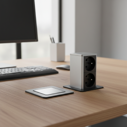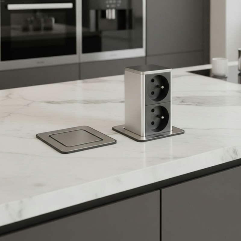 Moderná výsuvná zásuvka SQUARE UP v elegantnom nerezovom prevedení je dokonalým riešením pre kuchyne, kancelárie alebo pracovné priestory, kde je požadovaný čistý dizajn a nenápadné zabudovanie. V zatvorenom stave tvorí so stolovou doskou jednotný povrch – po potiahnutí sa jednoducho vysunie a sprístupní dve 230V zásuvky.