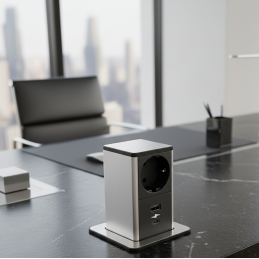 Moderná výsuvná zásuvka SQUARE UP v elegantnom nerezovom prevedení je praktickým riešením pre kuchyne, kancelárie či pracovné stoly. V zatvorenom stave pôsobí minimalisticky a nenápadne – po stlačení vrchnej plochy sa vysunie nahor a poskytne okamžitý prístup k elektrickému aj USB napájaniu.